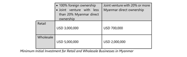On May 9, 2018, Myanmar’s Ministry of Commerce (MoC) issued Directive 25/2018 (the Directive) permitting 100% foreign owned companies, and joint venture companies established between Myanmar citizens and non-Myanmar citizens, to conduct retail or wholesale business in Myanmar, provided that they meet minimum initial investment requirements, register with the MoC, and comply with certain operational restrictions.